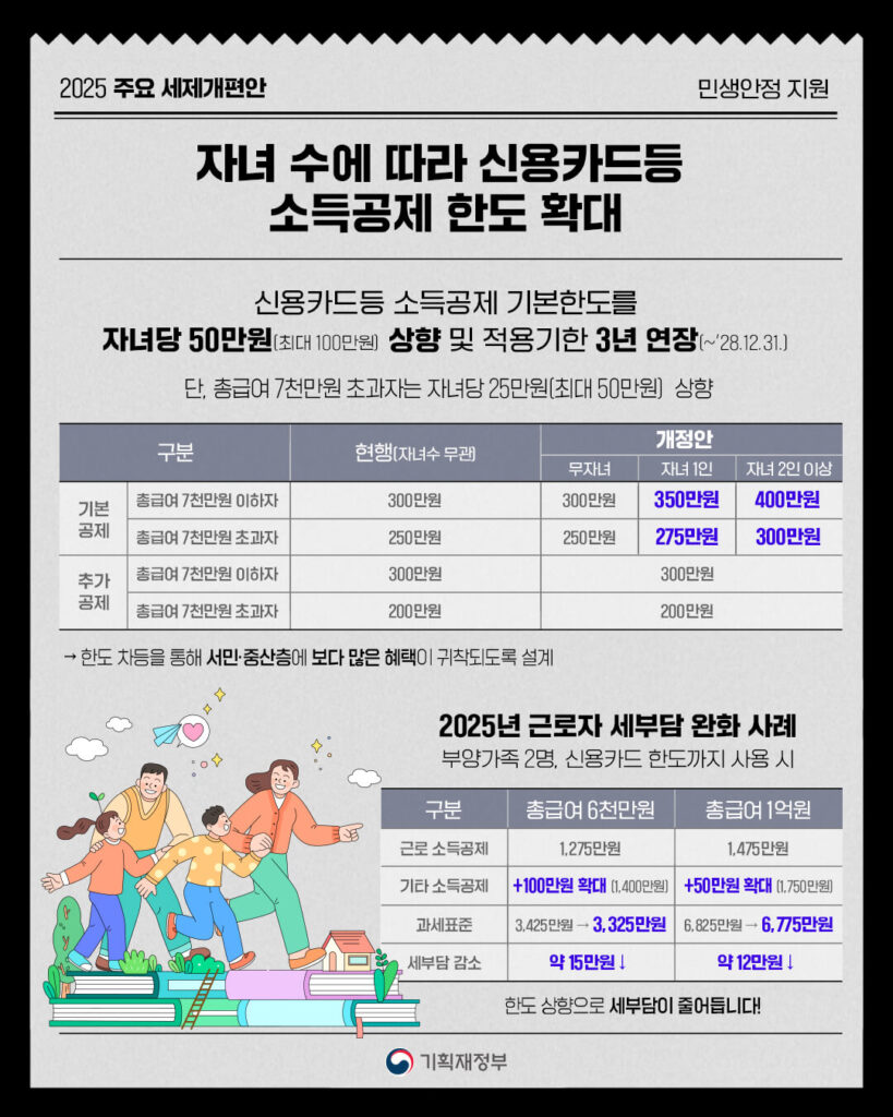 2025년을 맞아 기획재정부(기재부)가 발표한 ‘자녀 수에 따라 신용카드 등 소득공제 한도 확대’ 방안은